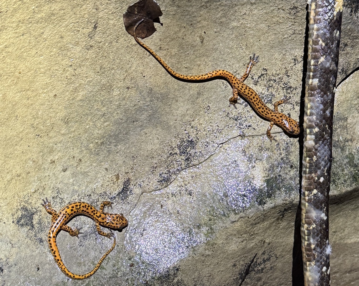 The bottom of Neversink is about an acre in size. There are two waterfalls coming down, both of which are opposite the rope. We did not have to rappel or climb in a waterfall. The sides of the pit have several ledges which are completely covered in ferns. The bottom has a pile of organic debris that has fallen in. We saw many frogs, several species of salamanders and some snakes. Jerel grabbed a corn snake and put it in a small bag to take it back to the top. We saw a live rattlesnake and a couple of dead snakes. Hayden found many different kinds of fungus growing on the debris.