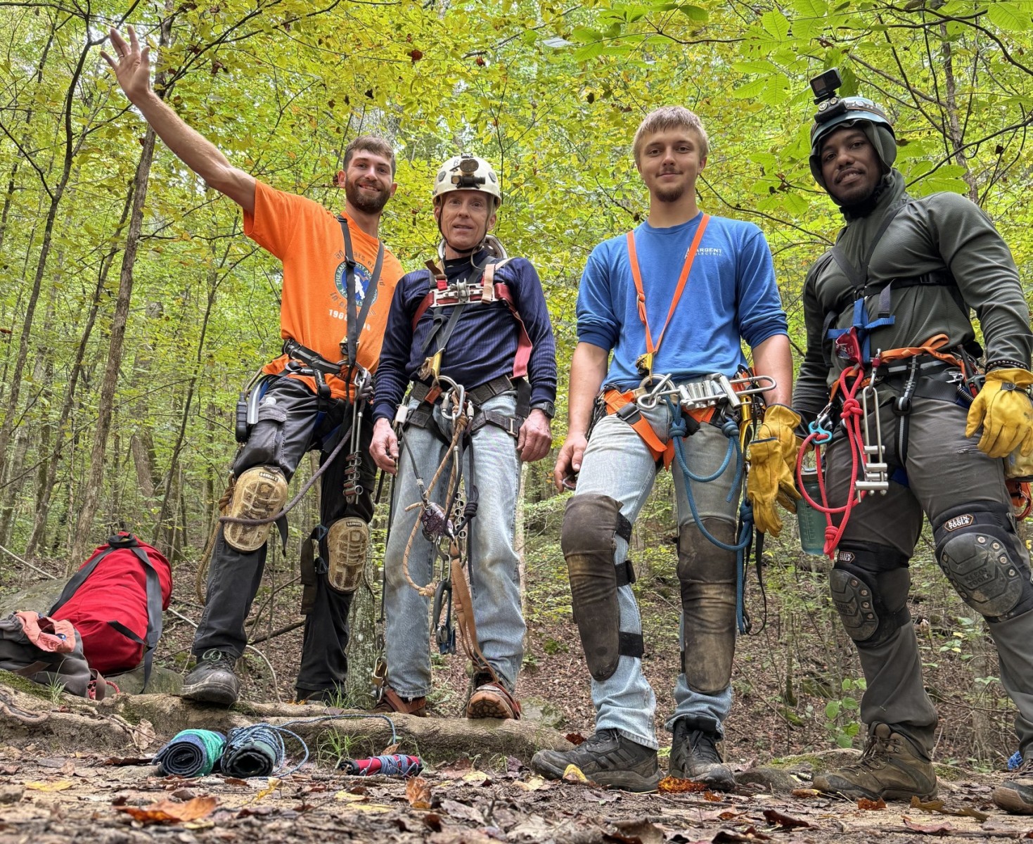 Wednesday afternoon turned into a major rain event. The campground received about 2 inches of rain between 1 and 6 pm. When Hayden and Tristin returned to camp, they were completely soaked. They had rigged the first drop at Hang ‘Em High, then descended and came back up. The trail to the cave is not long, but has almost 600 feet of elevation change. It is mostly vertical in many places.