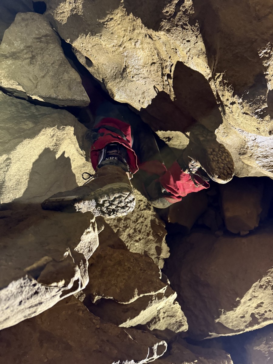 Cagle’s Chasm is just under 200 feet. I saw a half-dozen bolts and hangers as I went down. We did not use any of them. Some looked a bit sketchy. At the bottom is a fairly large room. There is a lower level, another 50 feet down, which we did not get to. On one side of the pit is a rope going up about 50 feet. Jerel climbed it first and reported a fair bit of cave at the top. Tristin and Hayden followed along while I stayed in the main room. I found a cave register on a shelf to one side. It was completely soaked inside, and there were no blank pages. We climbed out, derigged and were back at the vehicles around 4:30.